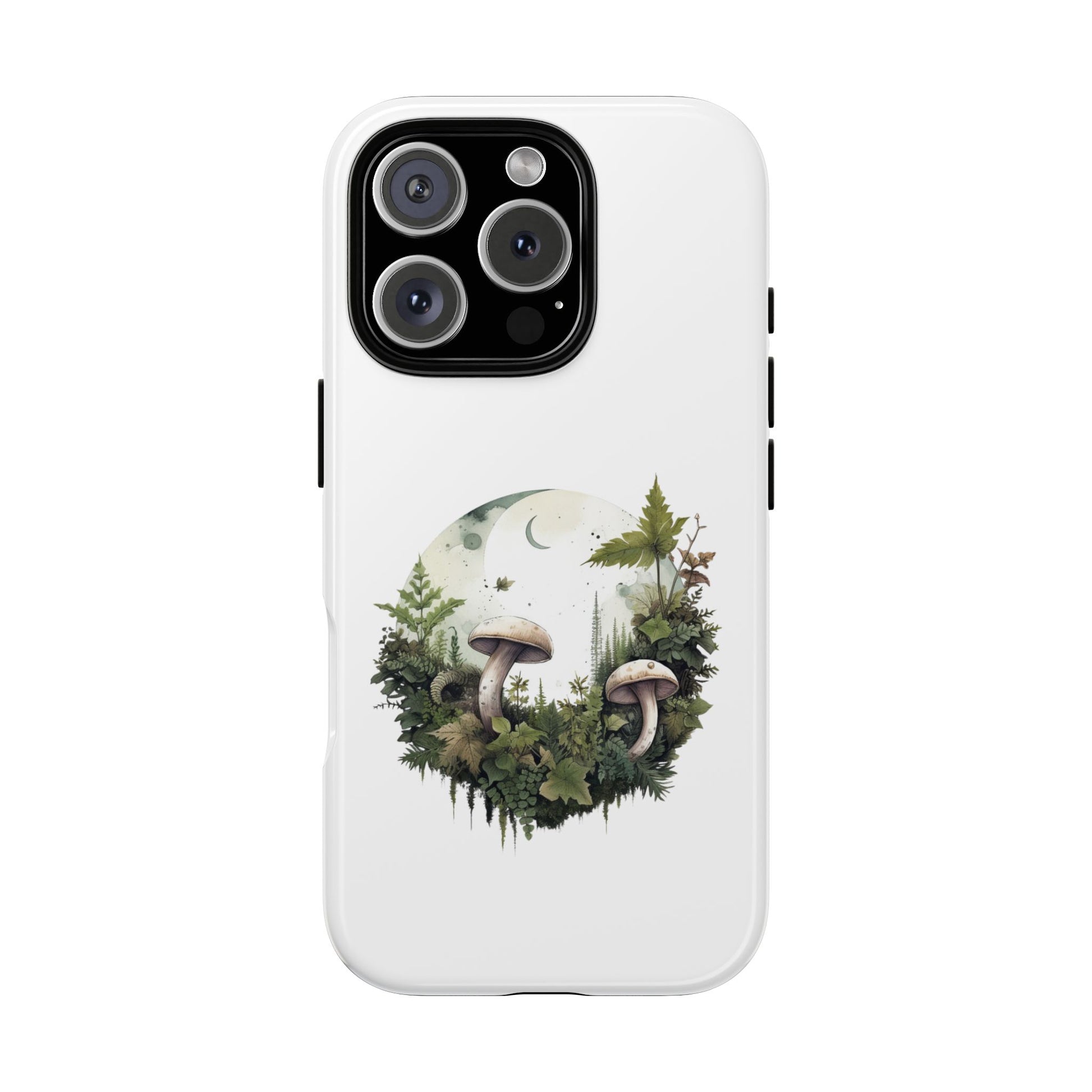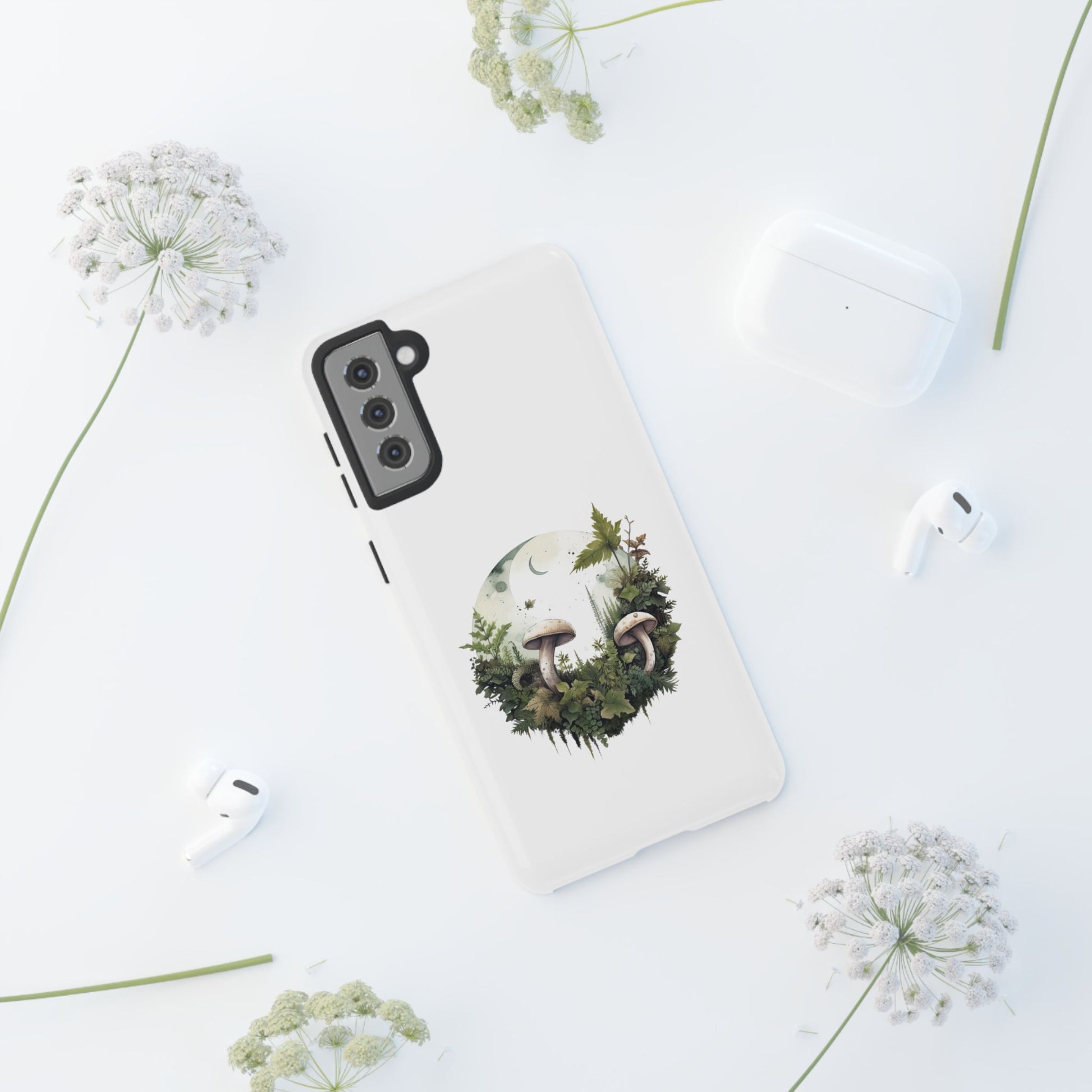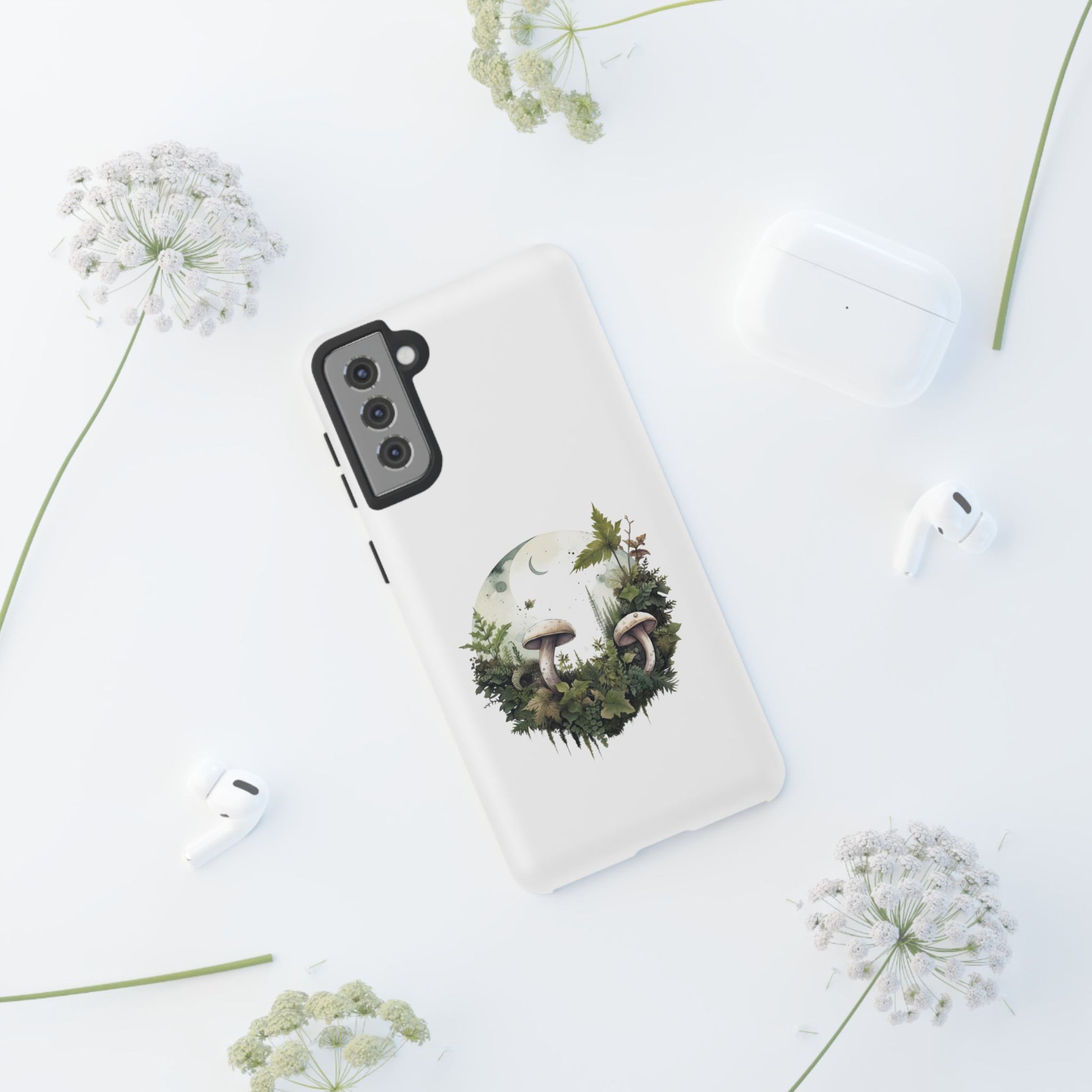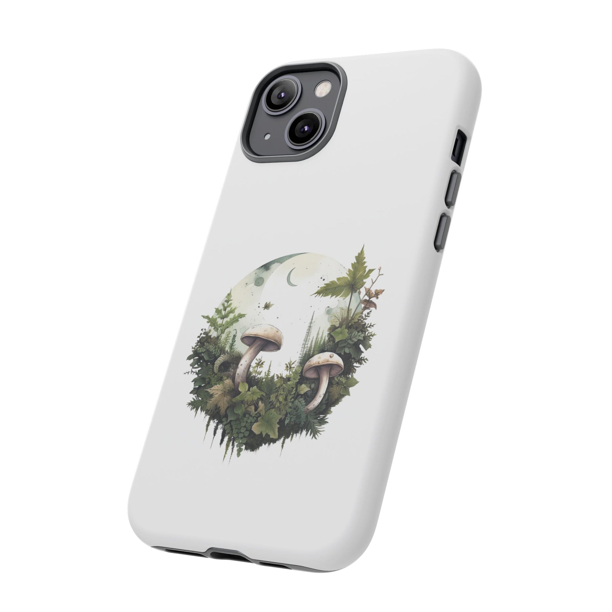 Embrace gentle forest vibes with the Moonlit Mushroom Wreath Tough Phone Case. A soft, circular illustration of mushrooms, leaves, and moonlight sits peacefully against a clean white background. Designed for minimalists, nature lovers, and fans of woodland magic.
