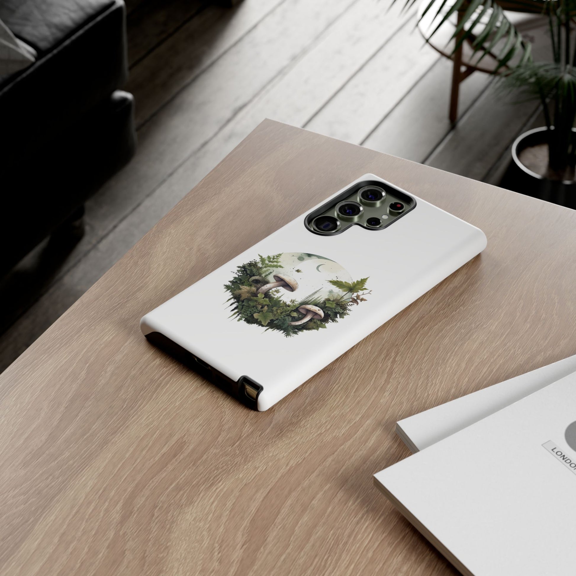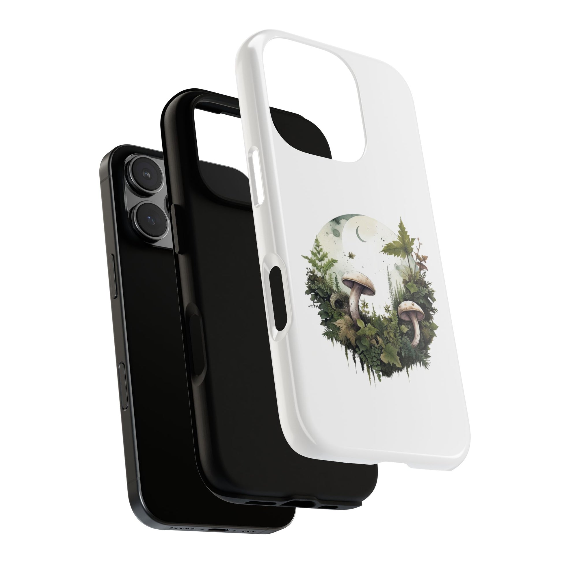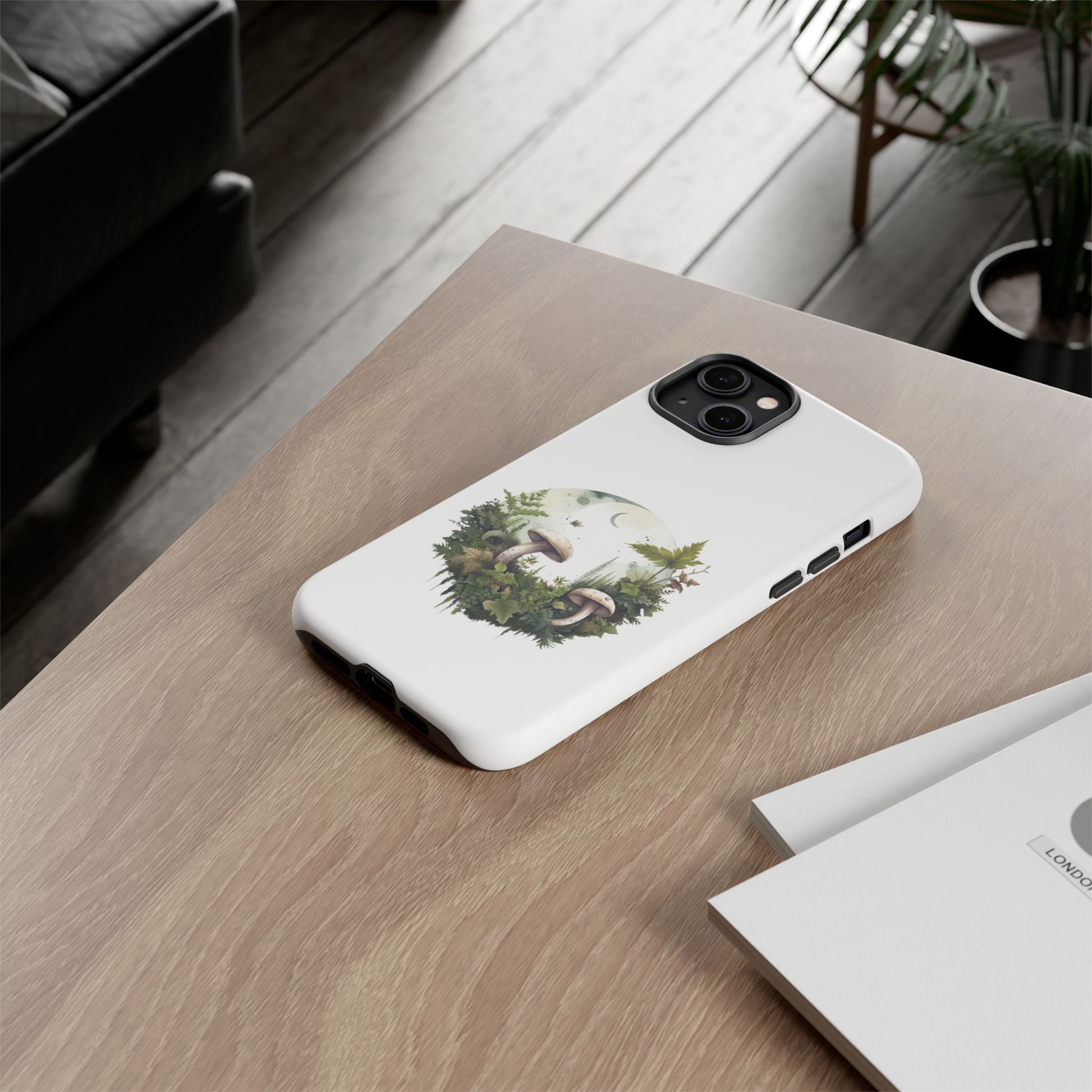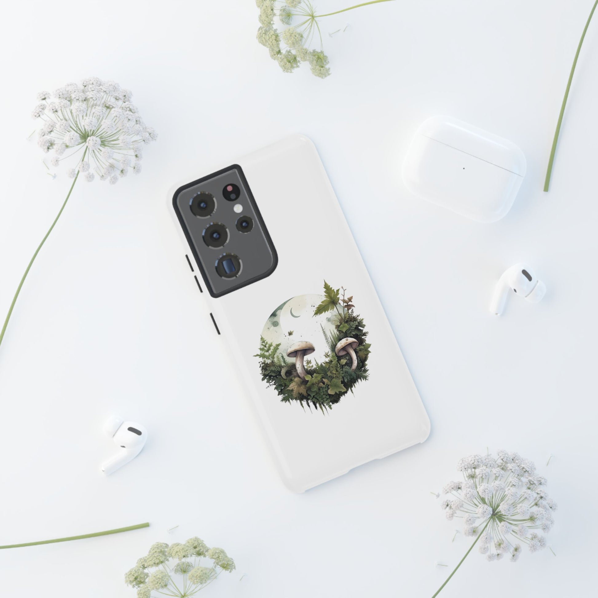 Embrace gentle forest vibes with the Moonlit Mushroom Wreath Tough Phone Case. A soft, circular illustration of mushrooms, leaves, and moonlight sits peacefully against a clean white background. Designed for minimalists, nature lovers, and fans of woodland magic.