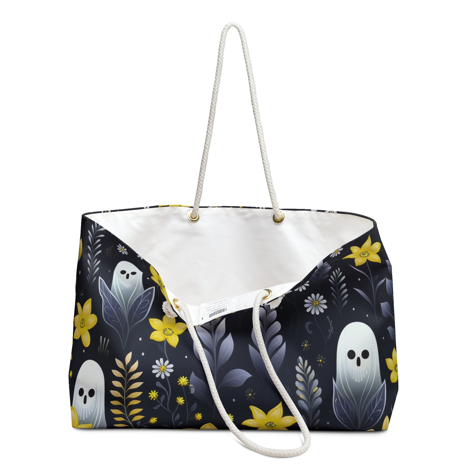 Turn every trip into an enchanting adventure with our oversized Yellow Floral Ghosts Weekender Tote. Designed for book lovers and explorers alike, this bag is adorned with a charming floral ghost pattern that adds a playful, Halloween touch to your travels. Whether you’re headed out of town or staying local, its wide-mouthed design ensures you can easily fit all your weekend essentials. The durable, T-bottom construction and cream sheeting interior lining keep your belongings safe and organized, while the thick rope handles make it a breeze to carry.